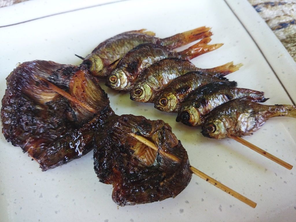 小さいフナを開いて串を刺し、甘辛いタレをつけて焼いたもの。