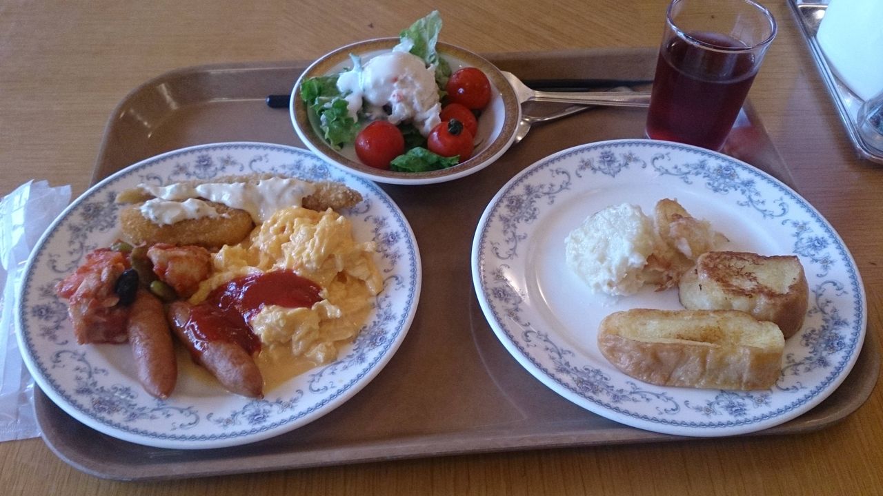 朝食終えた。バイキング朝食って洋食のおかずでごはんを食べたくって
