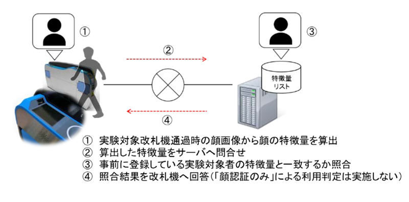 期間は11月12日~来年1月19日で、品川・名古屋エリアで働く社員約2千人が対象。実験では、東海道新幹線の品川駅と名古屋駅の改札それぞれ1台にカメラを設置。改札を通る乗客の顔の特徴を読み取ってサーバーにデータを送信。事前に登録した社員のデータと照合する。新幹線の予約情報などは従来どおりICカードを使って判定する。