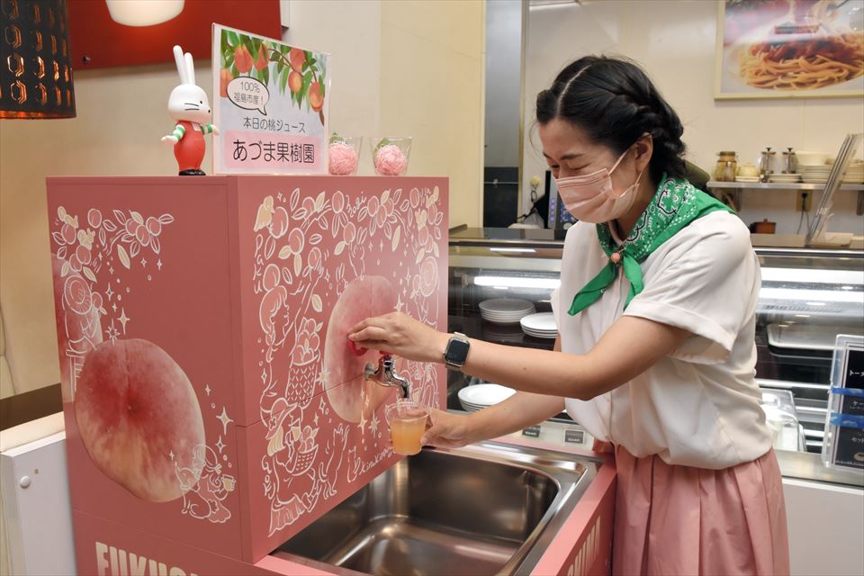 福島市観光コンベンション協会はJR福島駅西口改札前の「カフェ・アボカーレ」で市内産モモを楽しめる「蛇口から桃ジュース」の提供を9日から始める。