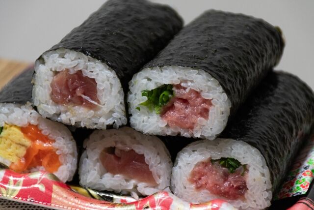いつも海鮮の刺身の恵方巻と、お肉の恵方巻の2種類で作ってる。お米はふるさと納税とかで毎月届くようにしてるんで、米でお腹いっぱいにしてもらおうかなと。