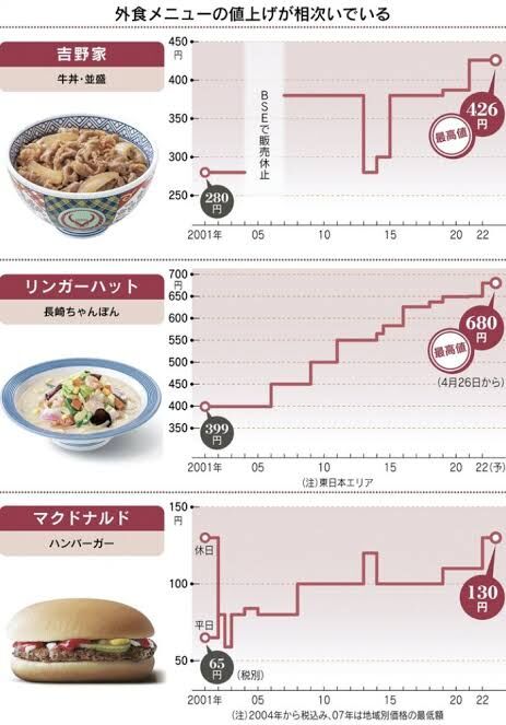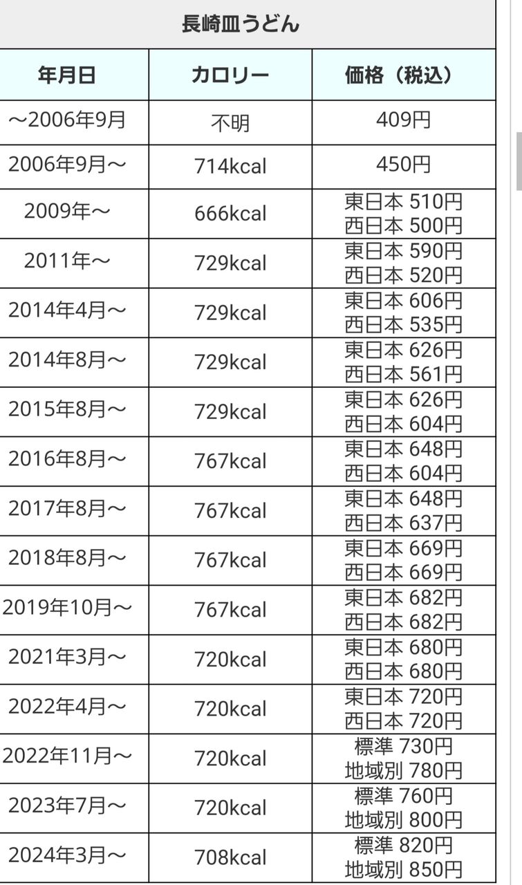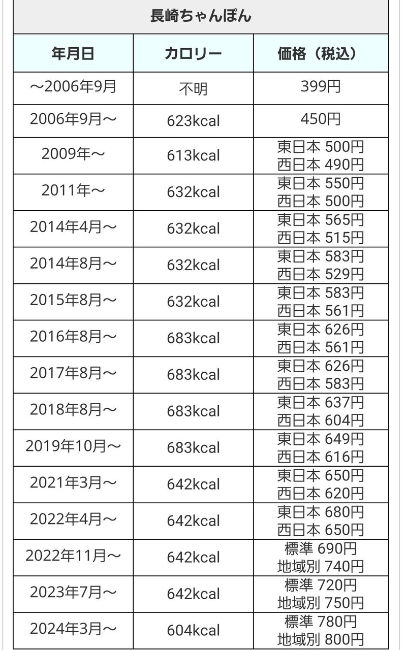 また地域別価格を導入している東京23区や沖縄県、北海道などの店舗でも引き上げ、「長崎ちゃんぽん」は800円が840円になります。