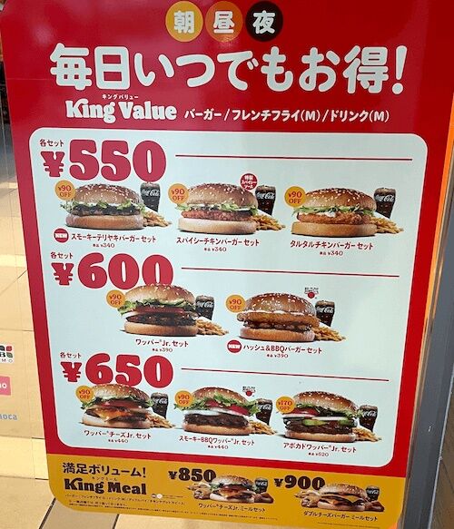 バーガーキングをめぐっては以前から「ボリューミーで本格派のバーガーだけど価格が割高」というイメージが強かったが、業界トップのマクドナルドがここ数年、値上げを重ね、さらにバーガーキングにはアプリ利用による大幅な値下げや常時提供されている500円台からのセットメニュー「オールデイ・キング」もあることから、両チェーンの実質的な価格差は徐々に縮まりつつある。