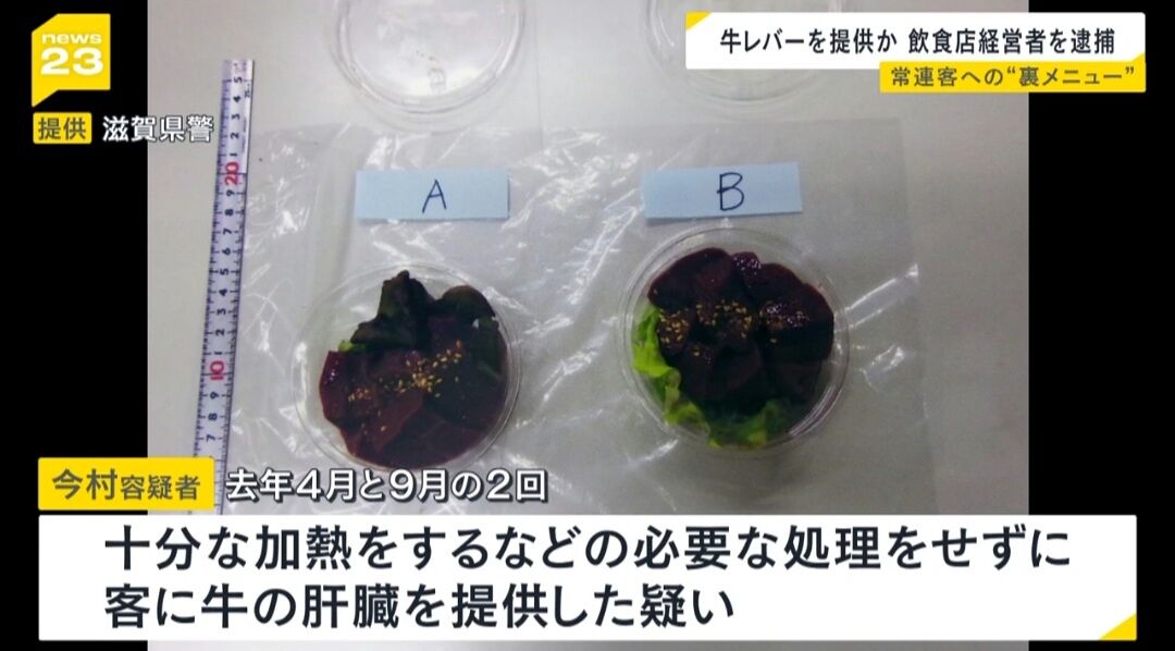発表によると、男は昨年4月18日と同9月12日、自身が経営する滋賀県豊郷町安食南の飲食店「肉料理滋ぃ家」で、加熱処理していない牛レバーを生食用として提供した疑い。