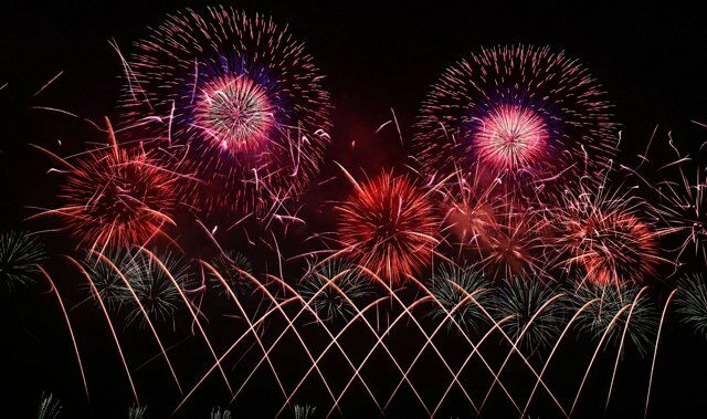 今回はカナダで発表した作品を拡充。日本伝統の「芯入割物(しんいりわりもの)」、さまざまな形を描く「型物」、無数の花を咲かせる「千輪菊」、色が変化する「グラデーション」などで約5分の間に2千発を盛大に打ち上げた。
