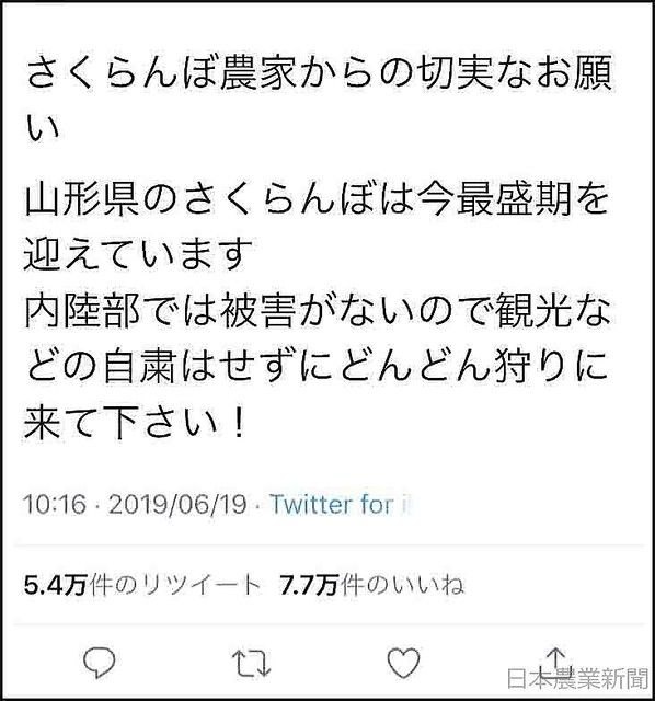 農家は、SNSを活用して呼び掛ける。「山形県のサクランボは今最盛期を迎えています。観光の自粛をせずにどんどん狩りに来て下さい!」「地震の被害はほとんどなく、普通に生活しています。ぜひサクランボ狩りに!」と発信する。寒河江市はホームページ上で、「サクランボ園の被害はございません」などと掲載しており、今後も情報提供に注力する。